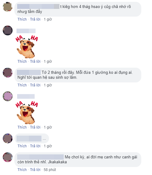 Các mẹ bỉm sữa từng trải qua cảnh “vợ nhịn chồng thèm” giống ở trên liền xúm vào bàn tán ầm ĩ: “Xong rồi có bị bắt gặp không hở mẹ nó?”, “Kể ra thì vừa hành sự vừa hồi hộp vậy cũng hay phết”; “Chắc là cảm giác mới lạ lắm”; “Bà ngoại kiêng kỹ thế, vợ chồng mình hơn tháng đã xông vào chiến đấu luôn rồi, lâu quá ai mà chịu được”…