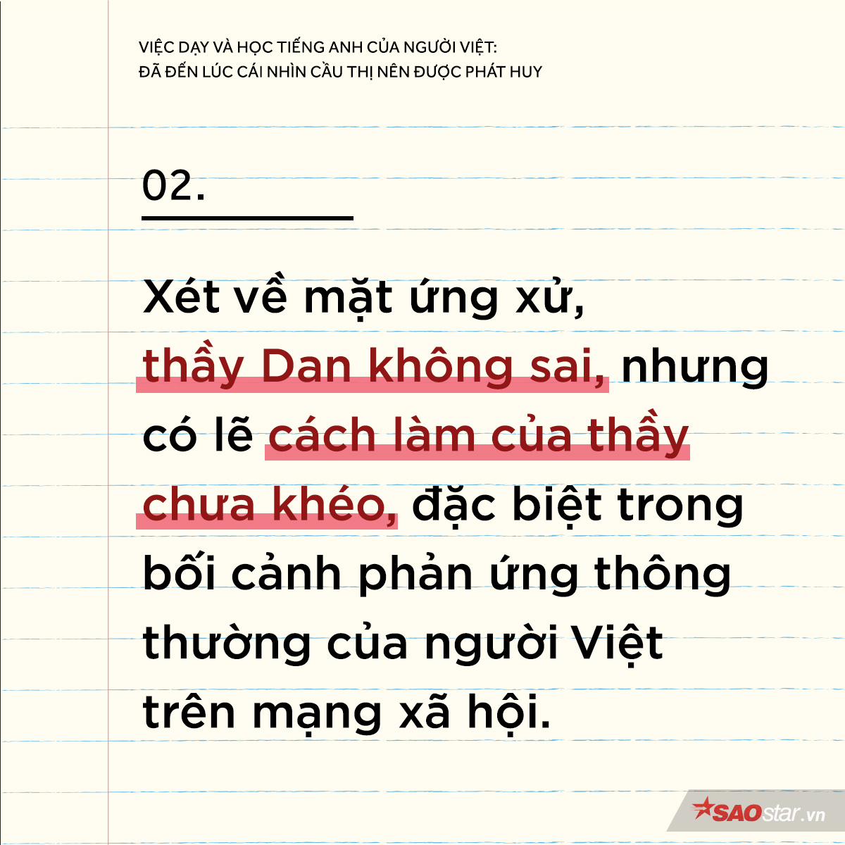 Tuy nhiên, cư dân mạng lại khiến cho câu chuyện đi xa hơn rất nhiều so với nội dung mà đoạn clip muốn gửi gắm. Dù một phần lỗi không đáng kể thuộc về phía người trong cuộc nhưng “những anh hùng bàn phím” - người không “nghe tận tay, thấy tận mắt” lại lên tiếng chỉ trích gay gắt hành động của thầy Dan. Dưới tác động của cư dân mạng, thầy giáo trẻ có vẻ đã trở thành một nhân vật phản diện. Từ việc mang danh “PR cho tên tuổi” và “dìm hàng” những trung tâm anh ngữ khác đến câu chuyện “vùi dập” người Việt, “tất tần tật” những cái mác này đều do chính cư dân mạng tạo nên.