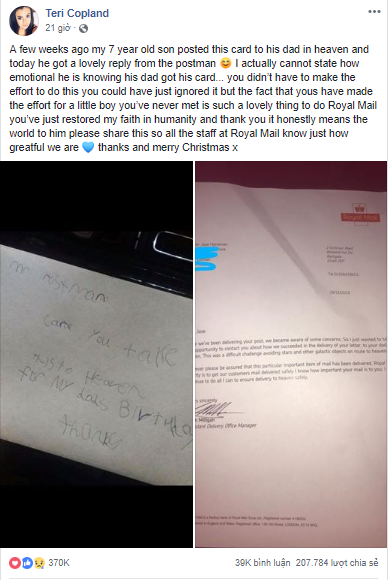 Ngày 29/11, tài khoản Teri Copland đã đăng tải bài viết về việc con trai 7 tuổi của cô viết thư cho bố trên thiên đường và nhận được phản hồi đầy bất ngờ của nhân viên bưu điện.