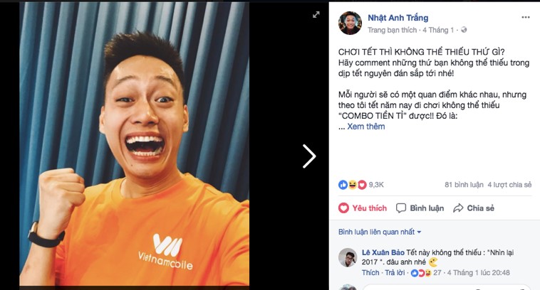 Thanh niên của năm Nhật Anh Trắng cũng đăng đàn với câu hỏi “Điều gì không thể thiếu khi chơi Tết”. Với riêng anh chàng, việc có một chiếc điện thoại xịn để check-in là điều bắt buộc phải có. Kế đến là 3G phải thật mạnh để đăng hình vì Tết hàng quán đóng cửa sẽ chẳng có Wifi. Và cuối cùng, Nhật Anh Trắng cầu may mỗi năm, nhưng năm nay thời thượng hơn với ước mơ tỉ phú với Vietlott…