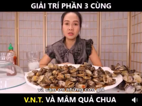 Kết thúc clip lại là màn cám ơn “sương sương” với món nghêu. Chị bắt đầu cám ơn biển, cảm ơn cát, cảm ơn sóng đã kết hợp với nhau để sinh ra con nghêu. Chị Vinh cũng cảm ơn người bán nghêu đã bán giá rẻ thì chị mới có nghêu để ăn.