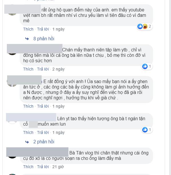 Tuy nhiên, có nhiều ý kiến bày tỏ sự đồng tình với quan điểm của chàng Vlogger này, bởi tuổi của các cụ cần được nghỉ dưỡng chứ không nên để các cụ làm Vlog, vừa làm khổ các cụ, vừa khiến các cụ trở thành “trò cười” của thiên hạ, bị bàn tán xôn xao.