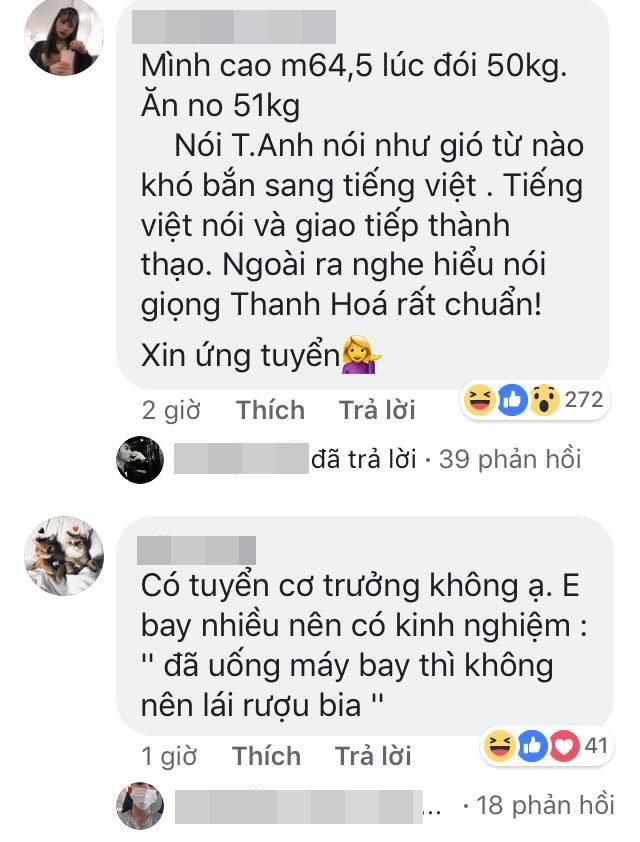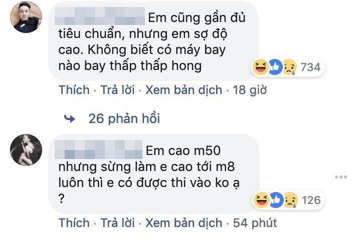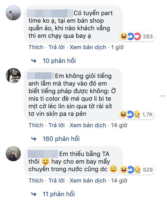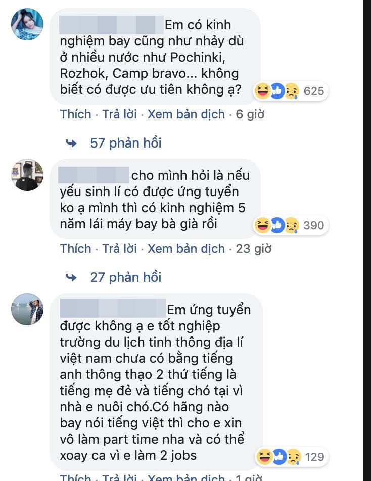 Ứng viên mong muốn tìm kiếm công việc thì chẳng thấy đâu, chỉ toàn thấy màn troll của các thánh lầy. Mở đầu bằng comment không thể hài hước hơn: “Có tuyển part time không ạ, tại em bán shop quần áo, khi nào khách vắng thì em chạy qua bay ạ”, rồi “Em thiếu bằng Tiếng Anh, hay cho em bay mấy chuyến trong nước thôi cũng được”, lại còn “em đủ tiêu chuẩn nhưng sợ độ cao, không biết máy bay có bay thấp không ạ”…