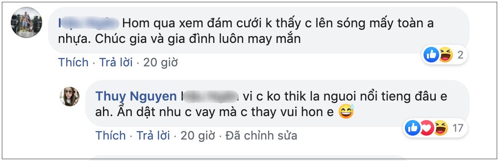 Lúc này, một số bình luận qua lại giữa chị Phương Thuý và bạn bè trên Facebook cũng gây chú ý. Bên dưới bài đăng loạt ảnh đi dự đám cưới, có người hỏi: “Mong chờ thấy em ngẩng cao đầu năm tay con gái bước lên sân khấu mà không thấy”. Đáp lại câu hỏi này, nữ doanh nhân trả lời vừa khéo léo, vừa đanh thép: “Vì mình có dắt hay không thì con vẫn là con mình. Với mình không thích diễn, không thích là người nổi tiếng nên chỉ sống ẩn dật và bình yên thôi.”