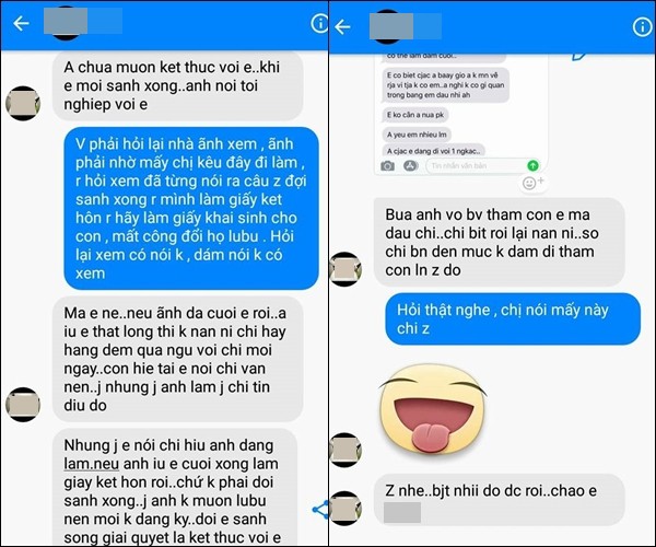 Tận đến khi em đang nằm trên giường sinh, cô ta cũng không quên đi khoe ăn ở với chồng em và kêu em đừng làm phiền bọn họ, cô ta nghiễm nhiên bảo em lấy tư cách gì can thiệp vào mối quan hệ đó, trong khi em mới là người được ba mẹ chồng mang trầu cau sang cưới hỏi. Cô ta còn nhẫn tâm đến mức khi em vừa sinh con thì lại điện thoại nhắn hỏi đã nhận được tin nhắn chồng mày bảo kết thúc chưa.