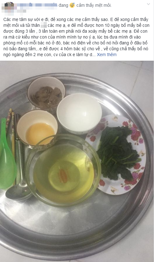 Tài khoản N.K.X tâm sự: “Đẻ xong mọi người thấy sao? Mình đẻ xong mệt mỏi và tủi thân quá! Đẻ mổ 10 ngày, bố bế con được đúng 3 lần. Cả 3 lần đều là mình mới đá xoáy mới bế mọi người ạ. Đẻ con ra mà như kiểu con của mình, mình tự lo. Lúc bác sĩ đưa mình bảo phòng mổ có mỗi bác ở đó. Điện cho chồng mình thì ông bảo đang tắm.