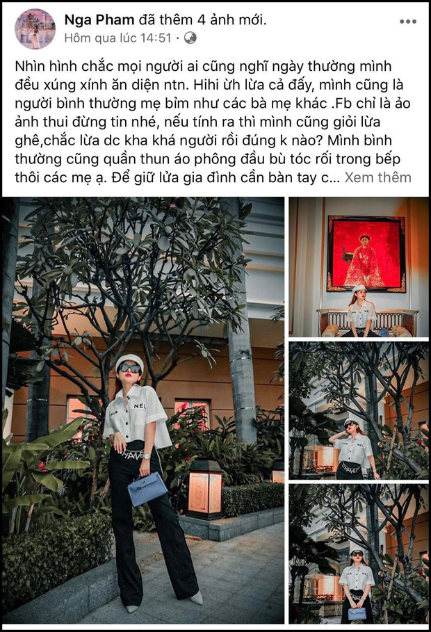 Mina Phạm - vợ hai đại gia Minh Nhựa luôn khiến nhiều người ghen tỵ vì cuộc sống sang chảnh, toàn màu hồng. Tuy nhiên, mới đây, trên trang cá nhân, cô tiết lộ cuộc sống thường ngày của bản thân cũng bình thường như bao người vợ, người mẹ khác. Những hình ảnh xa hoa trên Facebook đều là “lừa cả đấy”.