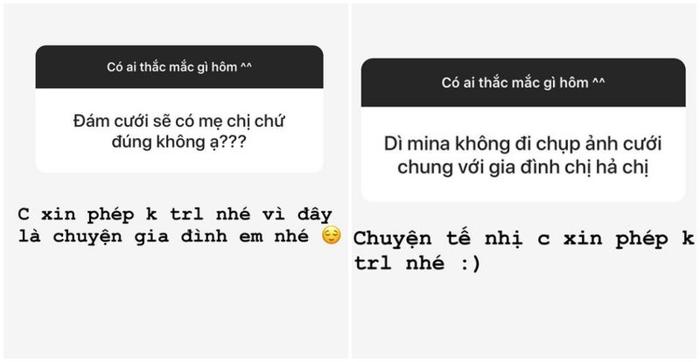 Trước đó, trong hàng loạt các story, Minh Phạm - con gái của Minh Nhựa - cũng tránh phải trả lời các câu hỏi liên quan đến mối quan hệ của cô và dì Mina. Thêm lùm xùm lần này nữa, có thể nói, mối quan hệ giữa Mina và gia đình chồng không được tốt đẹp như người ta vẫn tưởng.