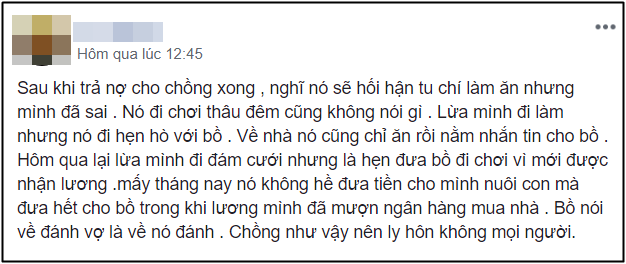 Thế nhưng, sau khi đọc câu chuyện của người mẹ trẻ này, bạn sẽ suy nghĩ rằng: “Tại sao cô ấy làm tất cả như thế, vậy mà chồng vẫn ung dung ngoại tình như chưa có gì xảy ra?”.
