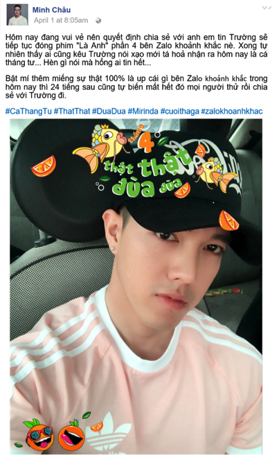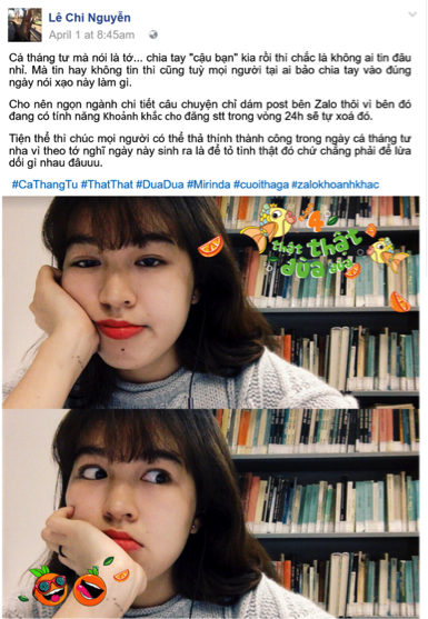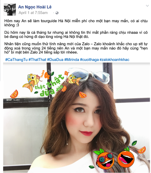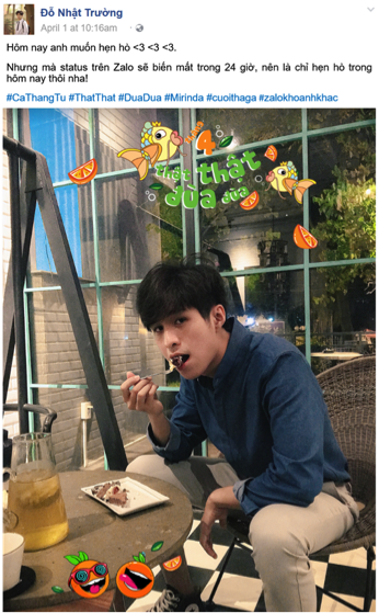 Mới đây, Zalo và Mirinda đã “bật mí” một tính năng mới mang tên “Zalo Khoảnh Khắc” chỉ xuất hiện vào ngày 01/04. Với tính năng này, các bạn có thể thoải mái “cầm cưa”, thổ lộ, giãi bày và “thả cá” nhé. Tất cả những bộc bạch “thật thật đùa đùa” của các bạn sẽ chỉ tồn tại trong 24 giờ đồng hồ, hết ngày 01/04Tài tử “Hàn Quốc” nào được Angela Phương Trinh phải lòng vậy các mem? thì Zalo sẽ xóa bay hết “cá” giúp bạn.