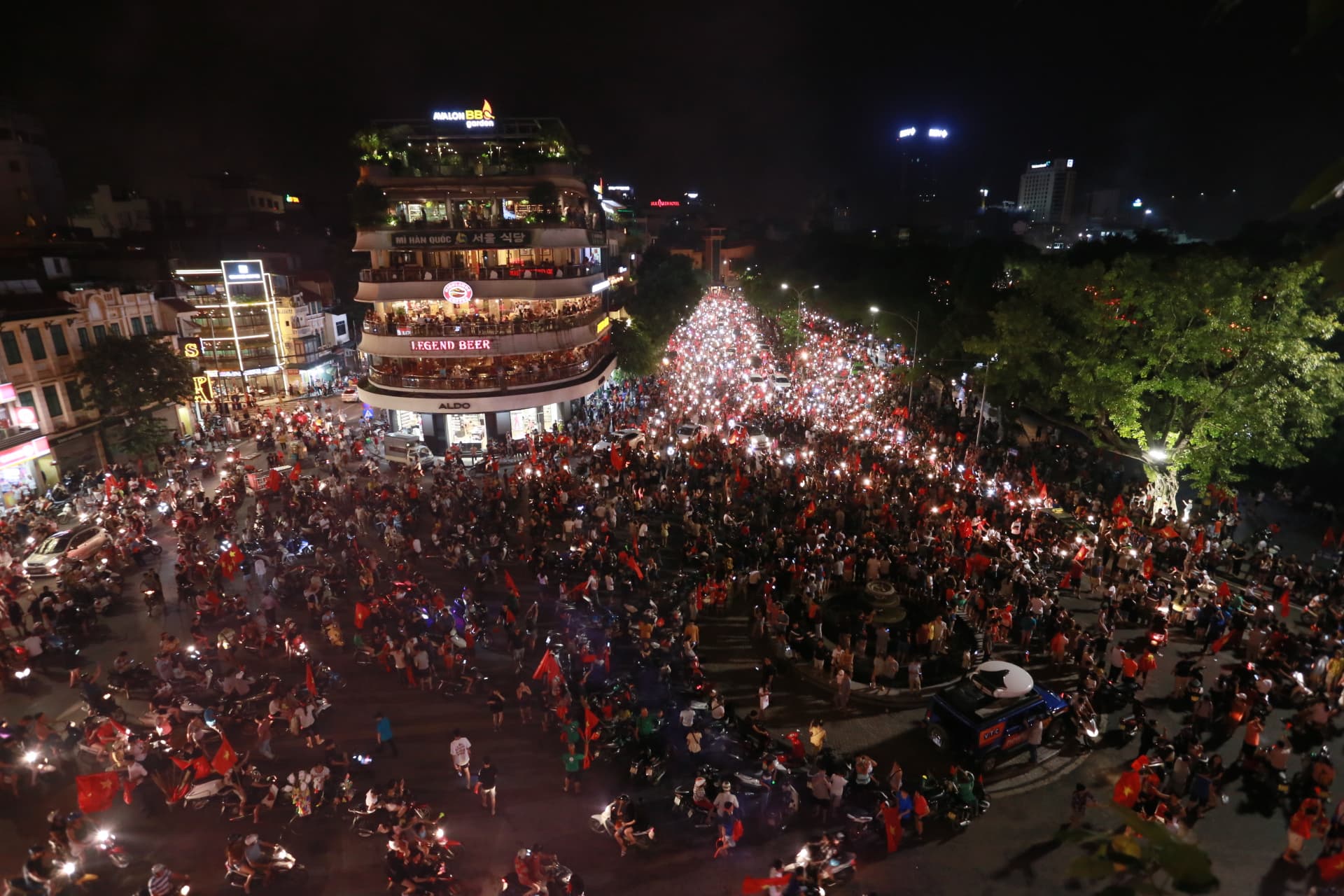 Người Hà Nội đổ ra đường ăn mừng quanh khu vực bờ Hồ Hoàn Kiếm.