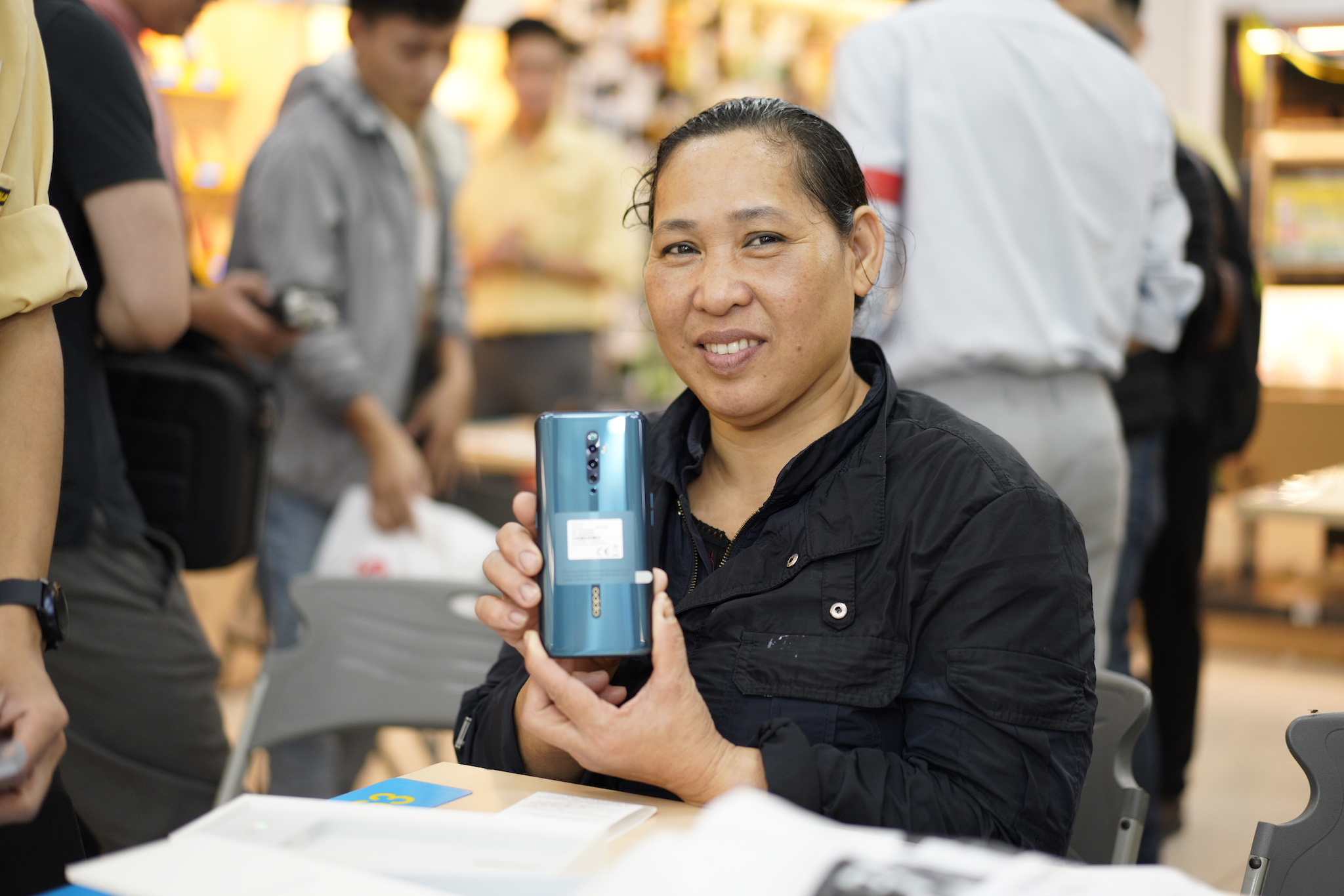 Trong số những vị khách đầu tiên có hai vợ chồng đèo nhau trên chiếc xe máy đi hơn 1 tiếng đồng hồ từ Ba Vì (Phú Thọ) đến cửa hàng để mua điện thoại mới. Hai anh chị cho biết đã gửi con cho ông bà trông, hy vọng sáng hôm sau có thể đem được về 2 chiếc điện thoại Reno2 F để thay cho hai chiếc điện thoại đã cũ ở nhà.