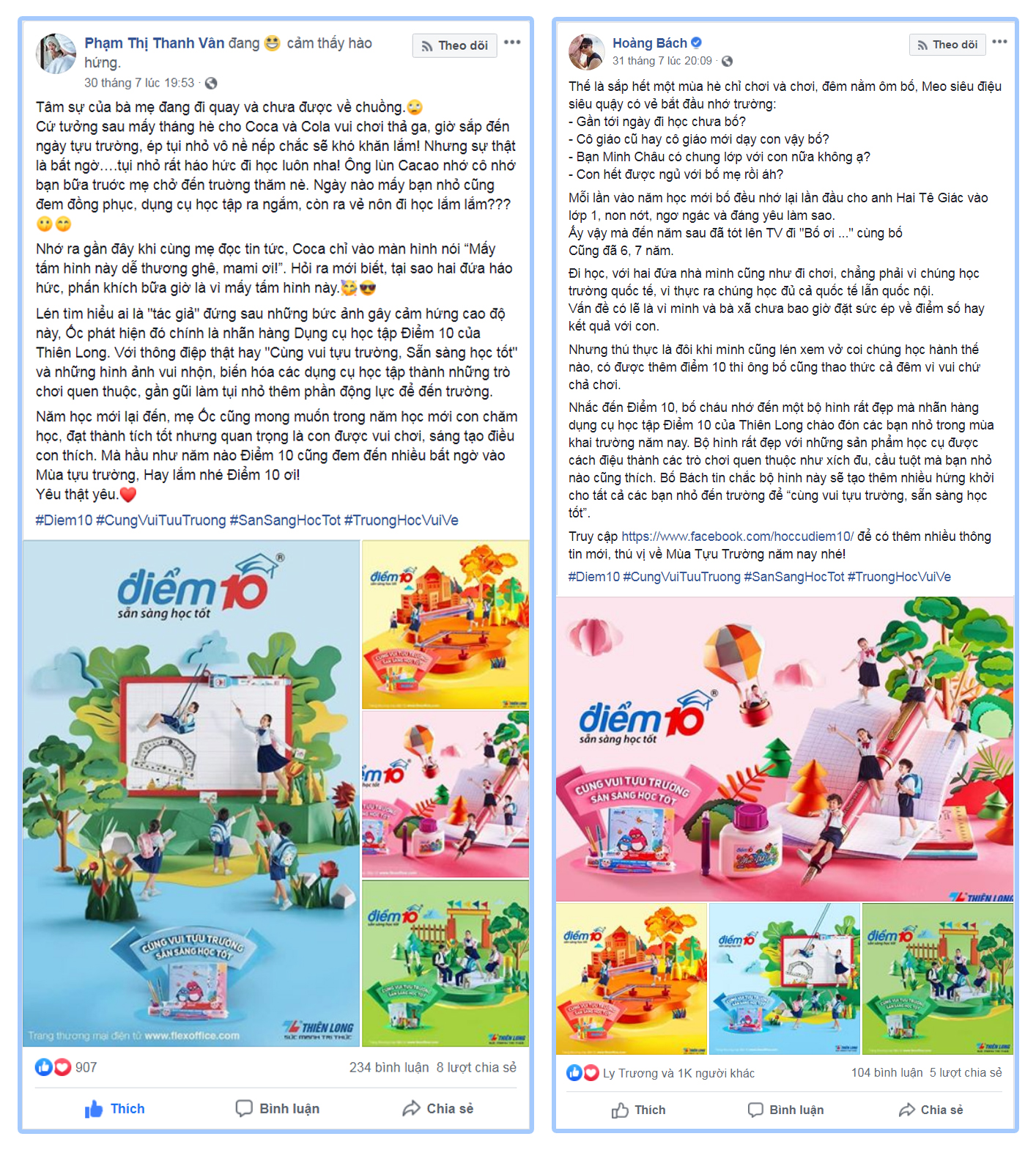 Chia sẻ của mẹ Ốc còn nhận được nhiều đồng tình khi cho rằng thông điệp “Cùng vui tựu trường, sẵn sàng học tốt” của Điểm 10 thật hay và ý nghĩa. Còn ông bố Hoàng Bách khi xem bộ ảnh thì nhớ về Tê Giác hồi mới vào lớp Một. Cả một thế giới học đường trong bộ ảnh được thể hiện sáng tạo và ngập tràn sự đáng yêu, vui nhộn, trên chính những học cụ thân yêu của bé.