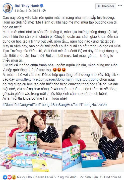 Trong khi đó, người mẫu Thúy Hạnh - bà mẹ nổi tiếng với 2 cô con gái đáng yêu Suli và Suti đã chia sẻ “bí kíp” giúp con học tập thuận lợi hơn nhờ sự hỗ trợ từ Điểm 10. Thúy Hạnh cho biết, quà tặng con khai trường mà mình chọn mua cho hai con là bộ học cụ Điểm 10 đang được bán rầm rộ trên trang thương mại điện tử www.flexoffice.com của Thiên Long. Mẹ Hạnh còn cho biết là bộ học cụ được phân loại theo từng cấp lớp học nên bố mẹ rất yên tâm vì vừa tiết kiệm thời gian mà vẫn mua được đầy đủ đồ dùng cho con trong niên học mới như: bút chì, bút máy, gôm, thước kẻ…,