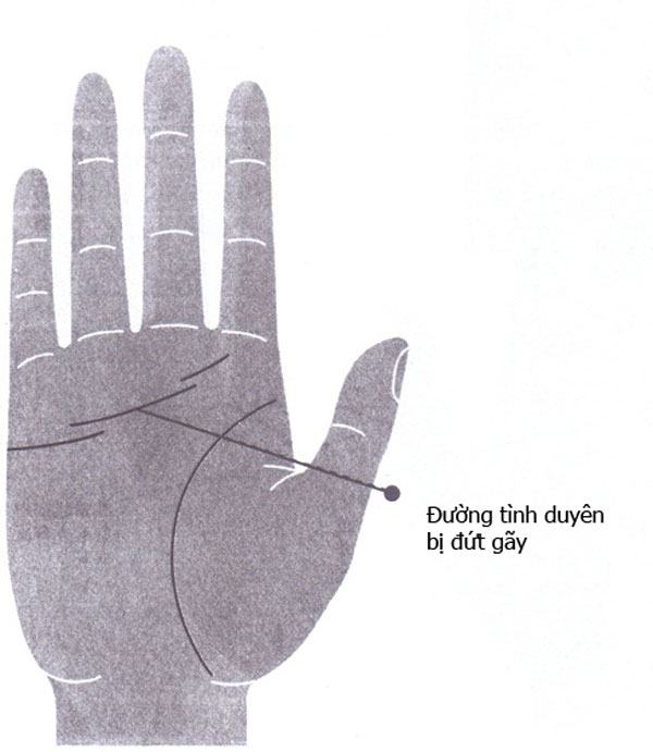 Nếu đường tình duyên bị đứt đoạn, chứng tỏ người này rất lận đận trong chuyện tình cảm. Một khi yêu ai, chuyện tình của họ dễ bị gia đình phản đối, ngăn cấm nếu không thì cũng chỉ một vài lý do nhỏ mà tình cảm rạn nứt, không thể lâu bền. Sau khi chia tay, họ cũng rất khó khăn để bắt đầu một mối quan hệ mới. Sau khi kết hôn, cuộc sống hôn nhân của bạn cũng không ổn định, hạnh phúc, vợ chồng bất hòa.