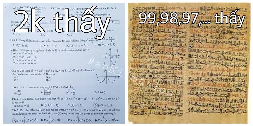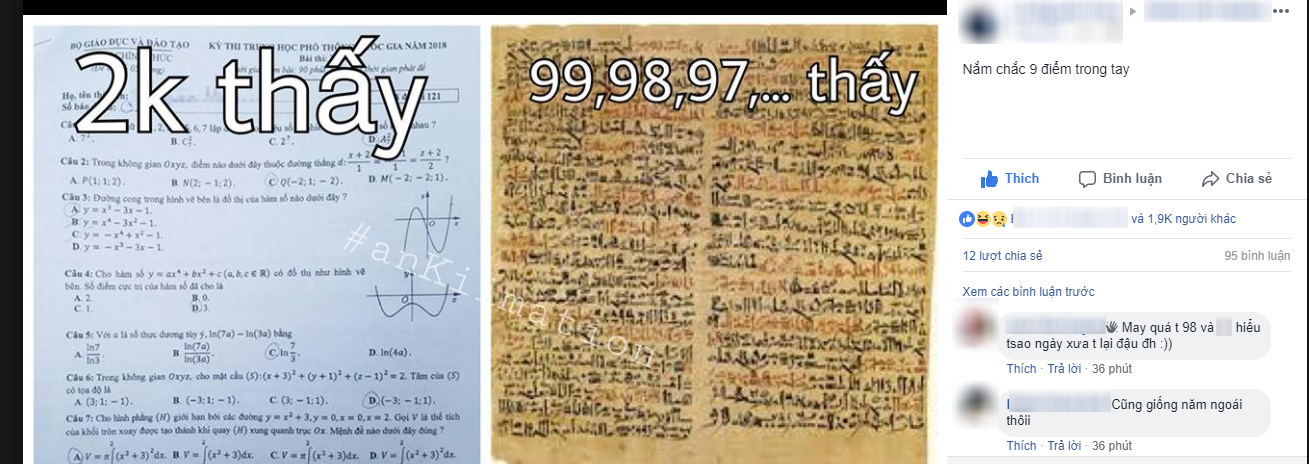 Sau khi đề Toán được công khai, tài khoản L.N.K hài hước viết trên một diễn đàn đông thành viên: “Nắm chắc điểm 9 trong tay”. Đây là câu nói của một sĩ tử ở TP.HCM sau khi bước ra khỏi phòng thi chia sẻ với các đơn vị báo chí, truyền thông. Tuy nhiên kèm với đó là một bức ảnh, một bên là đề Toán trong kỳ thi THPT Quốc gia 2018, một bên là mật mã gì đó nhìn không ai hiểu.