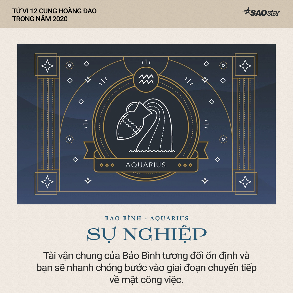 Xem tử vi cung Bảo Bình năm 2020 cho thấy, tài vận chung của cung hoàng đạo này tương đối ổn định và bạn sẽ nhanh chóng bước vào giai đoạn chuyển tiếp về mặt công việc. Do đó, bạn hãy nỗ lực để thể hiện tốt hơn khả năng và thành tích của bản thân trong công việc.