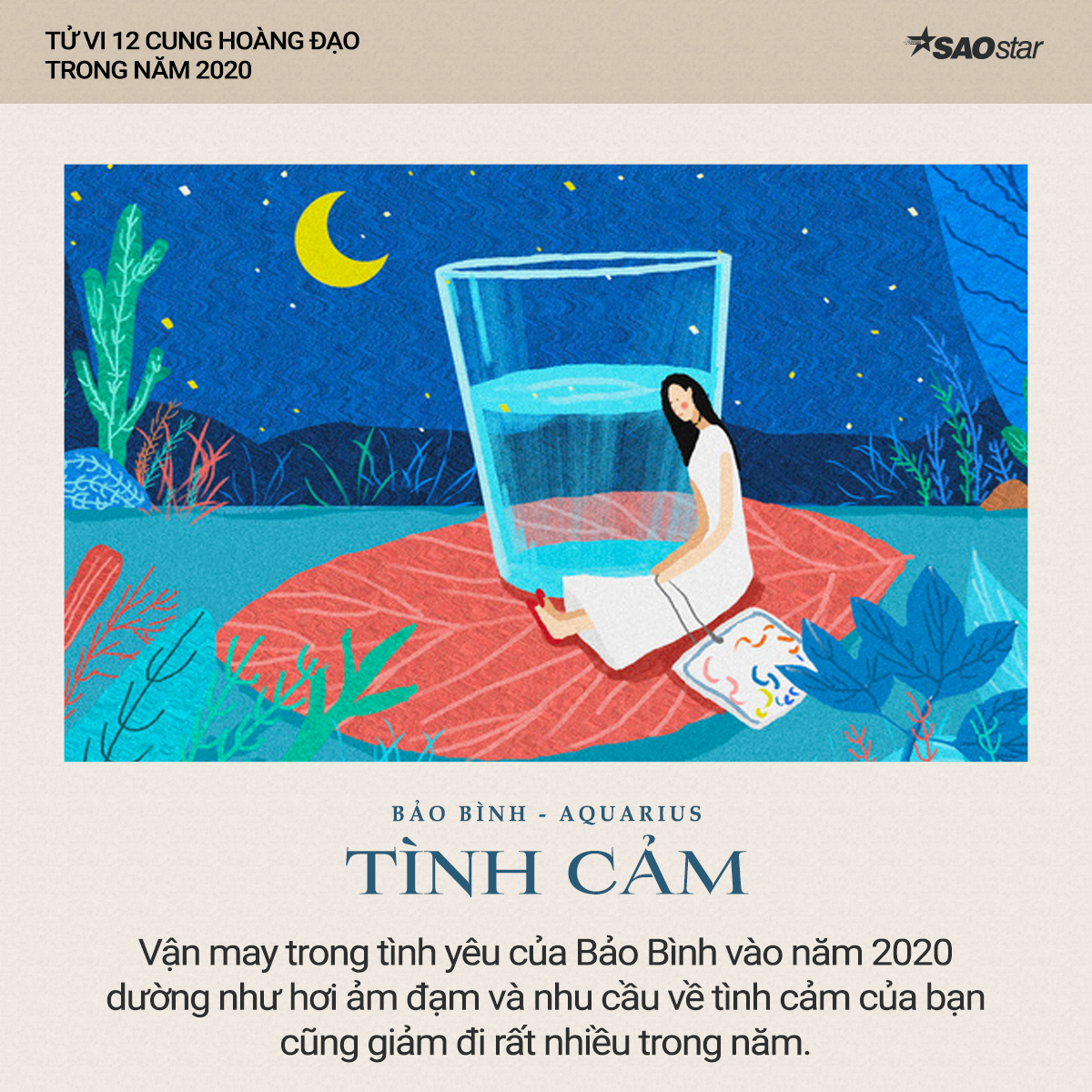 Theo tử vi 12 cung hoàng đạo, vận may trong tình yêu của Bảo Bình vào năm 2020 dường như hơi ảm đạm và nhu cầu về tình cảm của bạn cũng giảm đi rất nhiều trong năm. Tuy nhiên trên thực tế, vận đào hoa của cung hoàng đạo này cũng không hẳn là không có. Ngược lại, đối với những người độc thân, họ sẽ có cơ hội gặp gỡ nhiều đối tượng tiềm năng, chỉ có điều bạn khó để có thể duy trì một mối quan hệ lâu dài mà thôi.