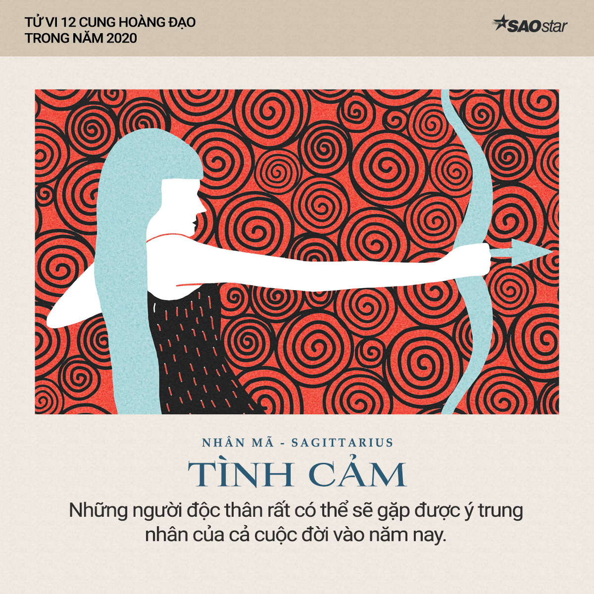 Nhân Mã sẽ có một năm mới 2020 tràn ngập hạnh phúc về tình cảm. Những người độc thân rất có thể sẽ gặp được ý trung nhân của cả cuộc đời vào năm nay. Khoảng giữa tháng 9 sẽ là thời điểm tuyệt vời cho tình yêu đối với những Nhân Mã đang tìm kiếm một nửa. Bạn hãy mở lòng và đón nhận nhiều điều mới mẻ trong tình yêu do sự liên kết giữa sao Kim và sao Mộc mang lại. Tuy nhiên, bạn cần biết nắm bắt cơ hội và chủ động lên nhé, đừng để sự thụ động và nhút nhát mà tự đánh rơi cơ hội với nửa kia của mình.