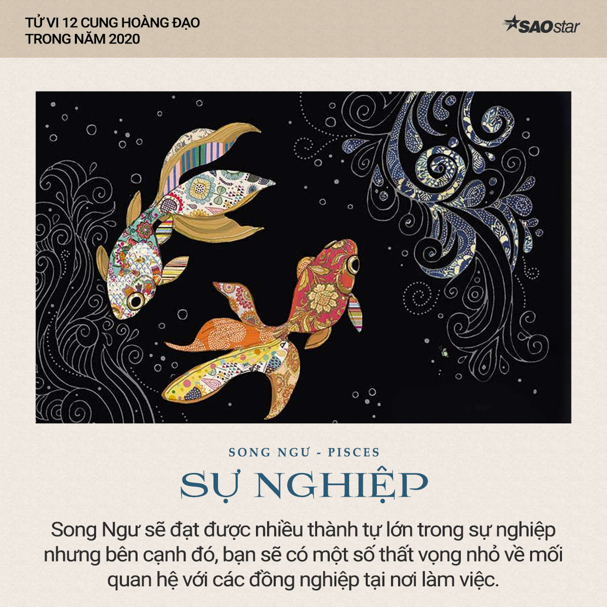 Xem tử vi cung Song Ngư năm 2020 cho thấy, chòm sao này sẽ đạt được nhiều thành tự lớn trong sự nghiệp nhưng bên cạnh đó, bạn sẽ có một số thất vọng nhỏ về mối quan hệ với các đồng nghiệp tại nơi làm việc. Nhìn chung, bạn sẽ làm việc rất tốt trong năm nay và có nhiều ý tưởng mới. Bạn cũng sẽ có thêm những mối liên hệ hợp tác làm ăn chuyên nghiệp và mang lại lợi nhuận cao.