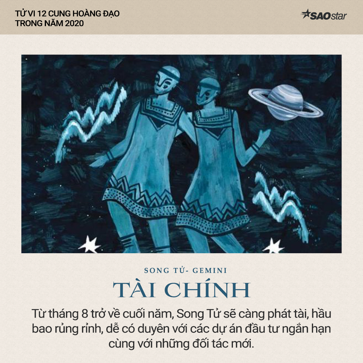 Xem tử vi cung Song Tử năm 2020 cho thấy, song hành với tiền đồ xán lạn, dù phải tham dự nhiều cuộc gặp gỡ tụ tập hoặc những lần mua sắm khá tốn kém nhưng Song Tử đều đã trù bị tích cực và biết khống chế chi tiêu vừa tầm nên sẽ luôn có khoản tích lũy kha khá cho bản thân.