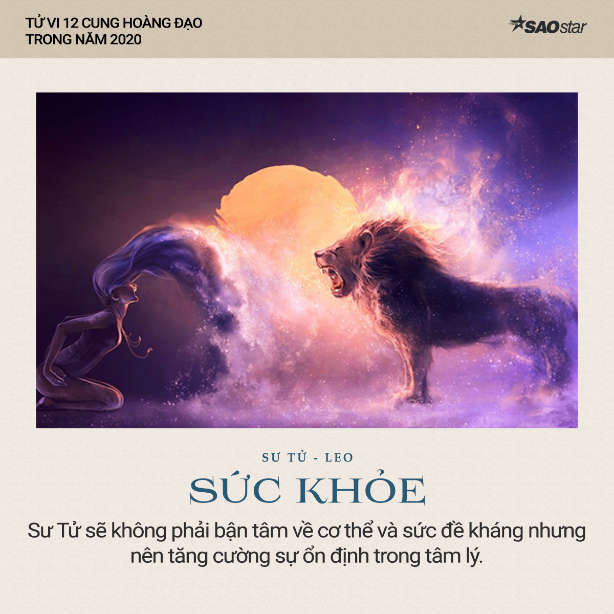 Xem tử vi cung Sư Tử năm 2020 cho thấy, cung hoàng đạo này sẽ không phải bận tâm về cơ thể và sức đề kháng nhưng nên tăng cường sự ổn định trong tâm lý. Đôi khi bạn sẽ bị ảnh hưởng bởi áp lực công việc nên tinh thần sa sút. Muốn đảm bảo một sức khỏe tốt, bạn hãy chú ý tìm cách giải tỏa stress và dành thời nghỉ ngơi nhiều hơn.