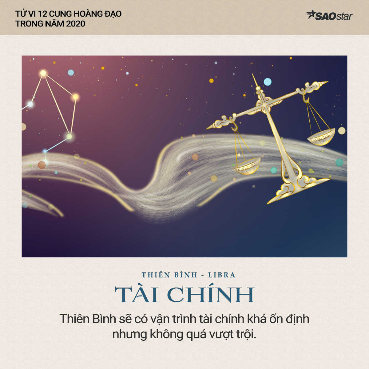 Xem tử vi cung Thiên Bình năm 2020 cho thấy, cung hoàng đạo này sẽ có vận trình tài chính khá ổn định nhưng không quá vượt trội. Tuy nhiên, bạn cần khéo léo cân đối thu chi và có kế hoạch tài chính hợp lý để mọi việc không vượt ra ngoài tầm kiểm soát của bạn.