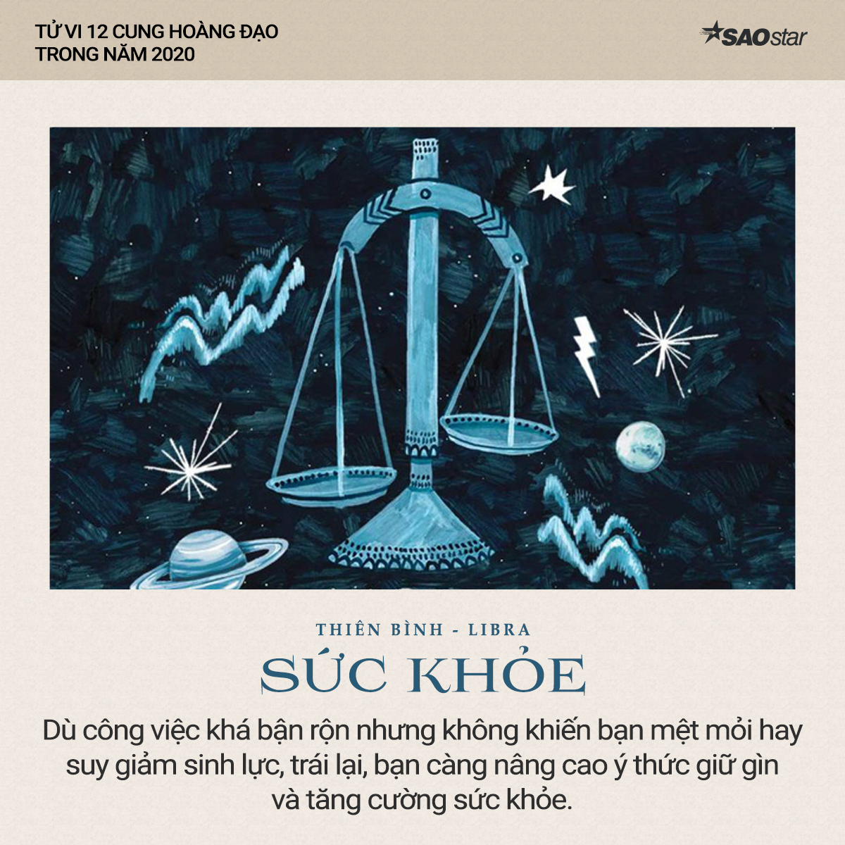 Xem tử vi cung Thiên Bình năm 2020 cho thấy, cung hoàng đạo này sẽ có một năm sức khỏe ổn định. Dù công việc khá bận rộn nhưng không khiến bạn mệt mỏi hay suy giảm sinh lực, trái lại, bạn càng nâng cao ý thức giữ gìn và tăng cường sức khỏe. Bạn có thể bắt đầu đẩy lùi nguy cơ bệnh mãn tính và học được cách nghỉ ngơi, thư giãn và làm việc một cách điều độ.