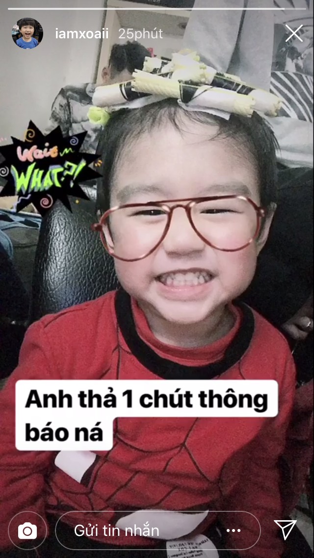 Có vẻ như Xoài rất thích được làm tóc nên cậu bé tỏ ra hớn hở và cười cực tươi. Mẹ Trang thì viết: “Anh thả một chút thông báo nha” nên ai cũng tò mò xem thành quả tóc xoăn của Xoài.