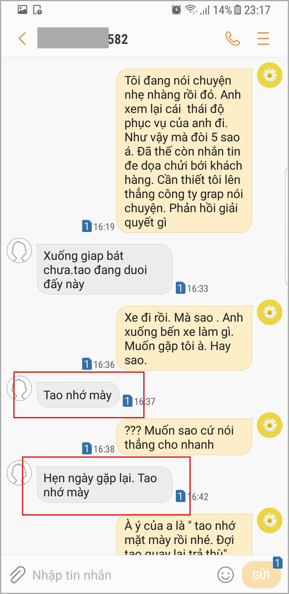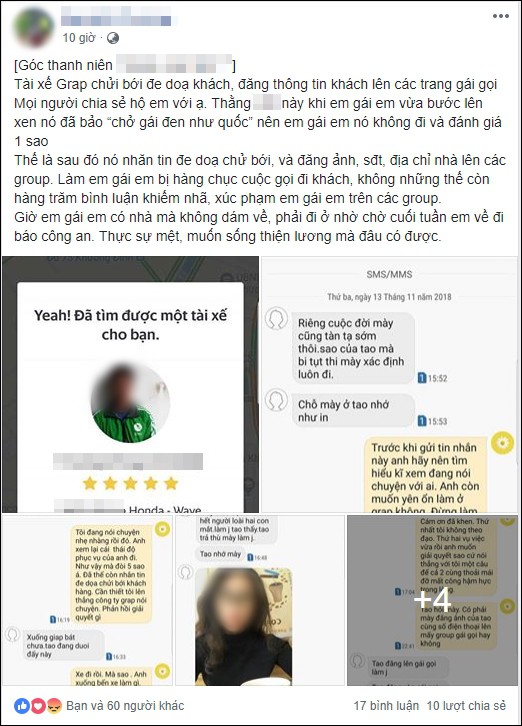 “Tài xế Grab chửi bới, đe doạ khách, đăng thông tin khách lên các trang gái gọi. Thằng này khi em gái em vừa bước lên xe nó đã bảo “chở gái đen như cuốc” nên em gái em nó không đi và đánh giá 1 sao. Thế là sau đó nó nhắn tin đe doạ chử bới và đăng ảnh, sđt, địa chỉ nhà lên các group làm em gái em bị hàng chục cuộc gọi đi khách, không những thế còn hàng trăm bình luận khiếm nhã, xúc phạm em gái em trên các group” - chị N.P bức xúc viết trên Facebook.