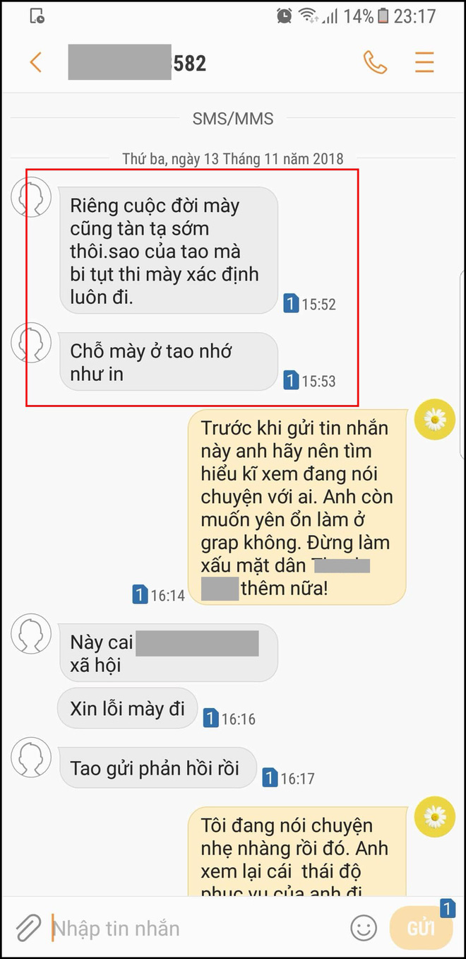 Sau mâu thuẫn trên, em gái của chị N.P đã nhận rất nhiều tin nhắn của tài xế GrabBike với nội dung hết đe doạ rồi lại khen xinh đẹp, đòi hẹn gặp vì “nhớ”. Thậm chí, nhiều số điện thoại lạ đã nhắn tin, gọi điện cho cô gái trẻ để gạ gẫm, hẹn hò đầy khiếm nhã. Chị N.P bức xúc cho rằng tài xế GrabBike đã đưa số điện thoại của em mình lên group “gái gọi” để trả đũa, do vậy em chị mới bị làm phiền.