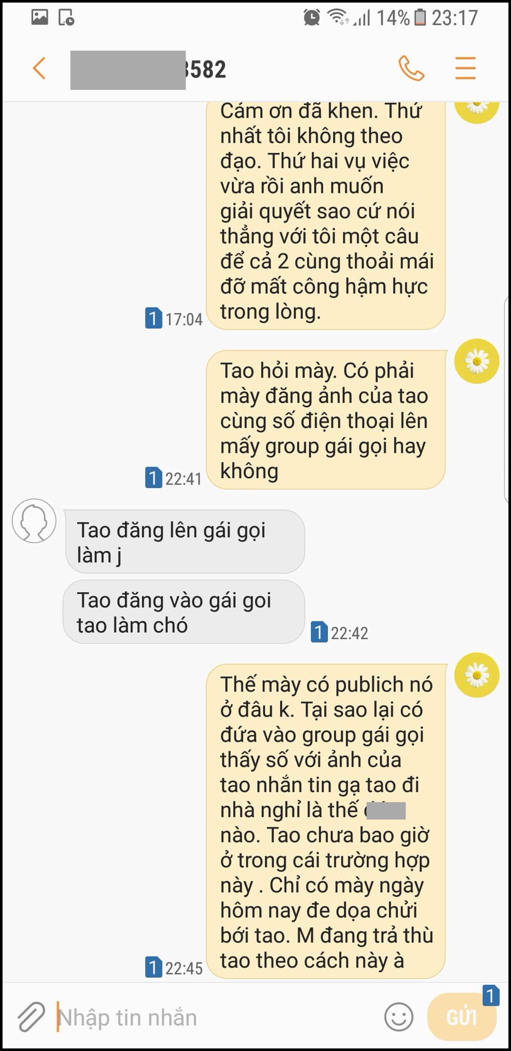 “Anh ta lên các group nói sai sự thật và còn đăng thông tin sđt, địa chỉ nhà mình lên các group làm em mình bị hàng chục cuộc gọi, nhắn tin rủ đi nhà nghỉ. Em mình là đứa ngoan ngoãn, hiền lành, cực biết điều. Nó chả bao giờ gây sự với ai. Nó nhát lắm, thế mà bị lôi ra bình phẩm, gạ gẫm” - chị N.P nói.