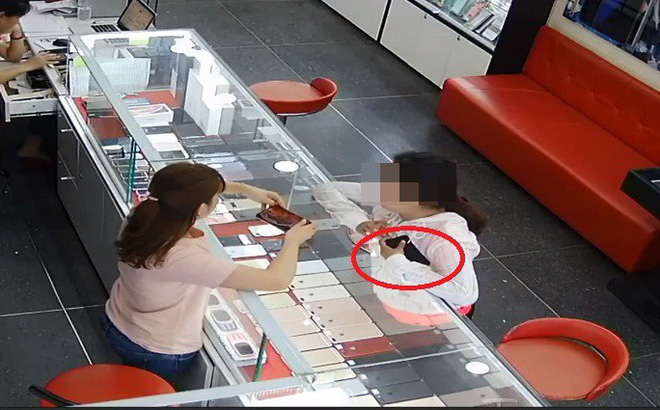Trong lúc nữ nhân viên quay đi tìm sản phẩm khác theo yêu cầu, chị nhanh như chớp đút điện thoại iPhone X vào túi quần mình một cách thản nhiên. Sau đó, chị vẫn nói chuyện như thường để đánh lạc hướng người bán hàng.