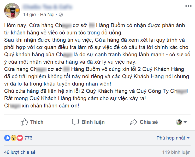 Fanpage trên đăng tải: “Hôm nay, cửa hàng Ch. cơ sở xxx Hàng Buồm có nhận được phản ánh từ khách hàng về việc có cụm tóc trong đồ uống.