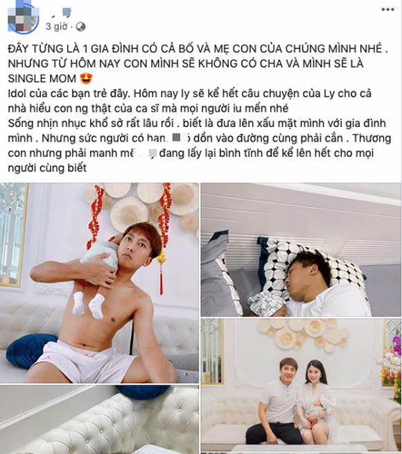 Cụ thể, trên trang cá nhân, cô gái này viết: “Đây từng là một gia đình có cả bố và mẹ con của chúng mình. Nhưng từ hôm nay, con mình sẽ không có cha và mình sẽ là mẹ đơn thân. Idol của các bạn trẻ đây. Hôm nay ly sẽ kể hết câu chuyện của Ly cho cả nhà hiểu con người thật của ca sĩ mà mọi người yêu mến nhé.