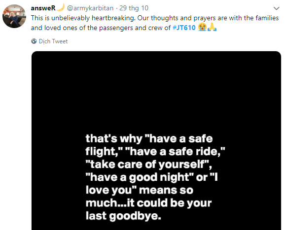 Ngoài ra, trên MXH Twitter chia sẻ câu nói: “That's why “have a safe flight”, “have a safe ride”, “take care of yourself”, “have a good night” or “i love you” means so much… it could be your last goodbye” (Tạm dịch: Đó là lí do vì sao, nói với nhau rằng “Bay an toàn nhé”, “Bảo trọng”, “Chúc ngủ ngon” và I love you” lại có nhiều ý nghĩa đến thế… Vì biết đâu đó sẽ là lời tạm biệt cuối cùng).