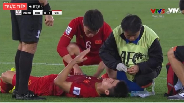Xuân Trường chạy đến hỗ trợ bác sĩ sơ cứu cho Duy Mạnh. Ảnh cắt từ màn hình.