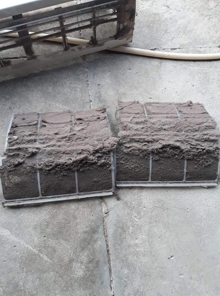 Tấm lưới lọc bụi của máy lạnh cũng dày đặc bụi. Ảnh: KSC