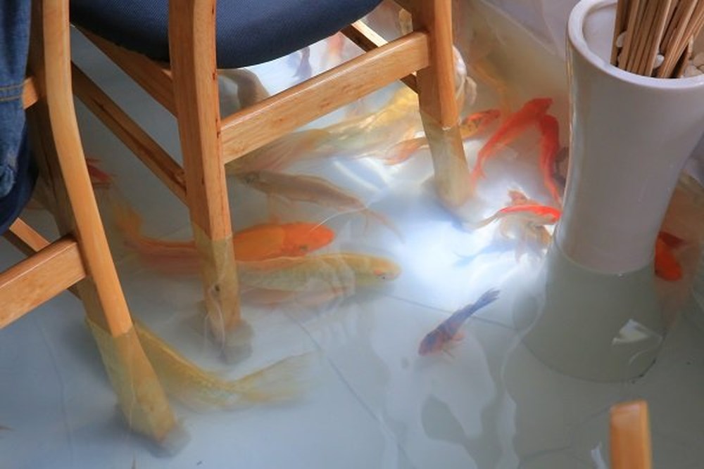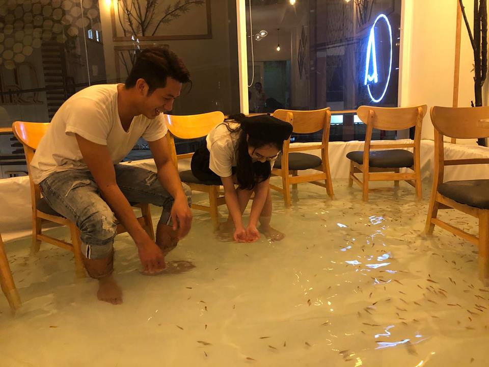 Không phải là một sân vườn rộng với hồ cá thiên nhiên, mà hồ cá này nằm trực tiếp ngay trong khu vực phòng uống cafe. Bước vào quán, bạn phải cởi giày, bảo đảm vệ sinh chân mới được vào. Bạn sẽ ngâm chân dưới làn nước, với những chú cá đủ kích cỡ bơi lội tung tăng trong lúc đang thưởng thức cafe.