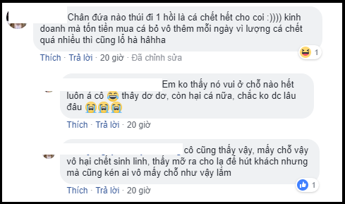 Sau nhiều tranh cãi, đa số ý kiến đều cho rằng đây là cách kinh doanh ”bất chấp”, chưa kể còn gây tác hại đến sức khỏe của con người và cả đàn cá. Người ta sẽ chỉ đến 1 lần vì tò mò, sau đó họ sẽ không đến nữa. Điều này thật sự không có lợi về khía cạnh kinh doanh.