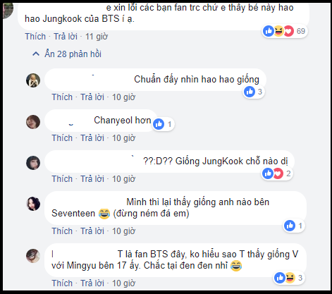 Thậm chí, các cô gái còn thi nhau so sánh xem Đình Nguyên trông giống ai. Người thì bảo giống Jungkook (BTS), người thì cho rằng giống Winwin (NCT) hoặc Chanyeol phiên bản ”da đen” một chút.