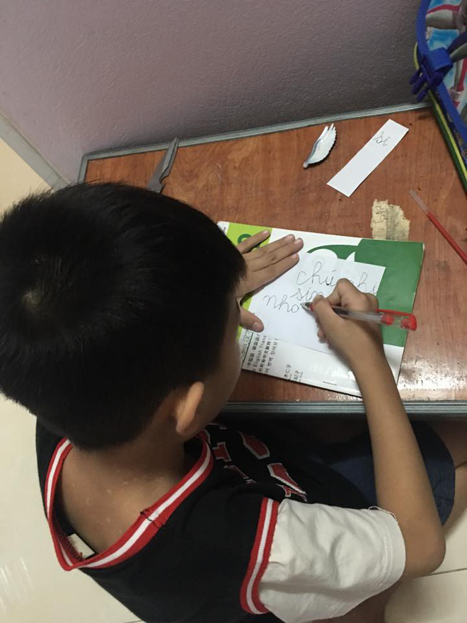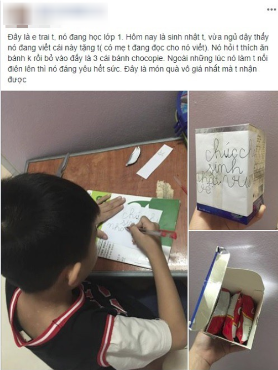 Kèm theo hình ảnh là dòng tâm sự của cô gái: “Đây là em trai tôi, nó đang học lớp 1. Hôm nay là sinh nhật tôi, vừa ngủ dậy thấy nó đang viết cái này tặng tôi (có mẹ tôi đang đọc cho nó viết). Nó hỏi tôi thích ăn bánh không rồi bỏ vào đấy là 3 cái bánh chocopie. Ngoài những lúc nó làm tôi nổi điên lên thì nó đáng yêu hết sức. Đây là món quà vô giá nhất mà tôi nhận được”.