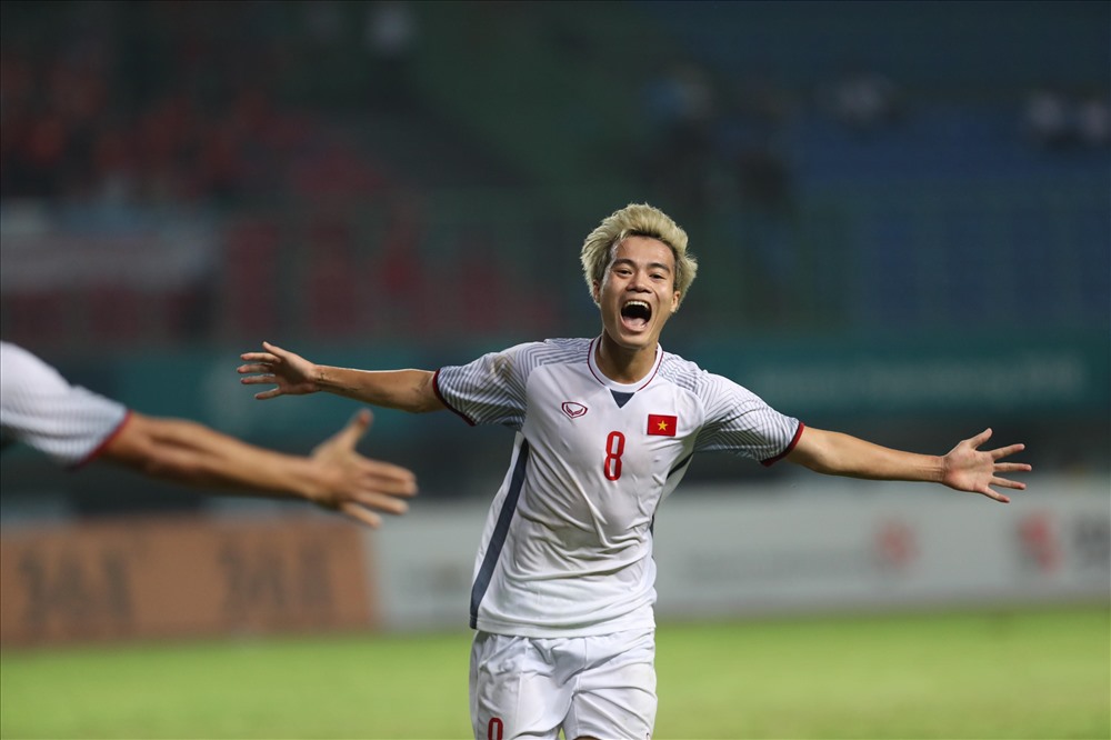 Nhìn thấy hình ảnh này không cần nhắc người hâm mộ cũng biết đây là dấu mốc giúp đội tuyển Việt Nam bước vào bán kết ASIAD lần đầu tiên trong lịch sự. Ở phút 108 hiệp phụ thứ 2 gặp Syria, Văn Toàn với mái tóc bạch kim đã khiến người hâm mộ vỡ òa với bàn thắng vàng. Ảnh Lao Động.