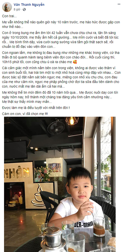 Mới đây, nhân sinh nhật lần thứ 10 của Tường Minh, trên trang cá nhân, Vân Hugo đã viết một bức tâm thư đầy tình cảm gửi con trai mình.