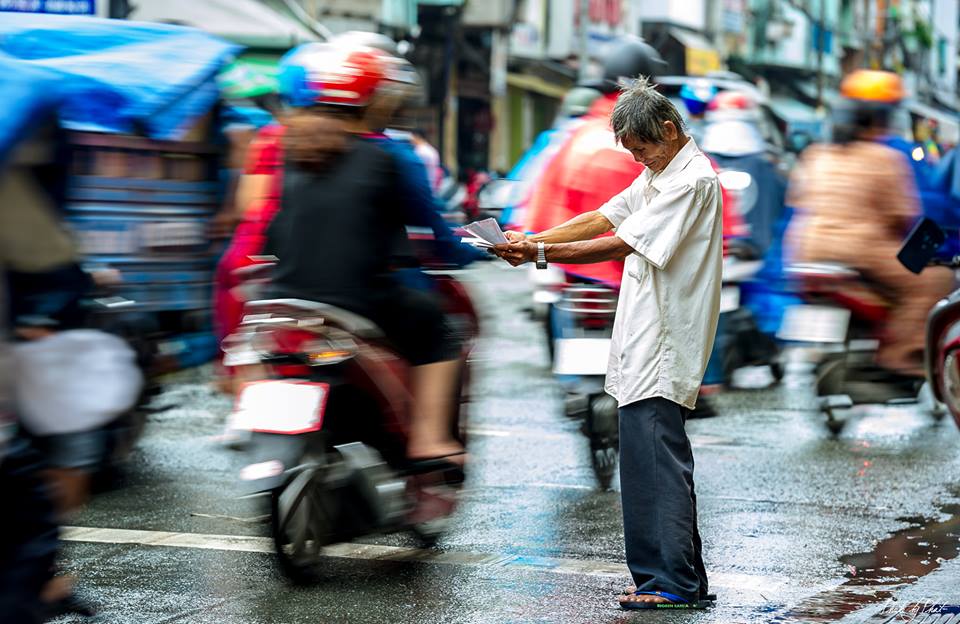 Tối 29/5, trên mạng xã hội xuất hiện hình ảnh một cụ ông đứng giữa trời mưa và dòng người lúc tan tầm ở Sài Gòn. Tay ông chìa ra xấp vé số mời người đi đường nhưng chỉ nhận lại cái lắc đầu không ai chú ý khi ấy ông đang mếu máo.