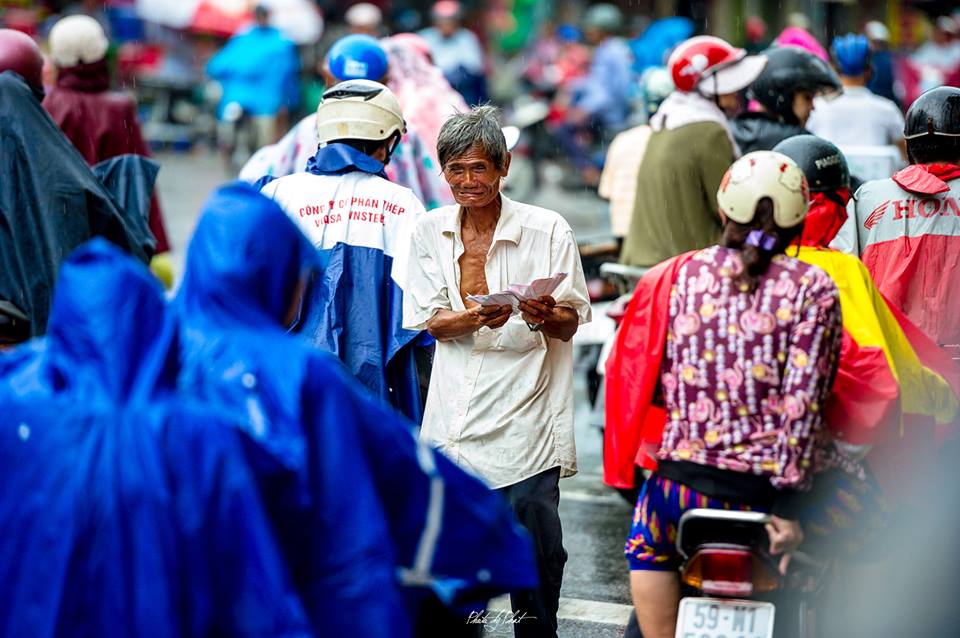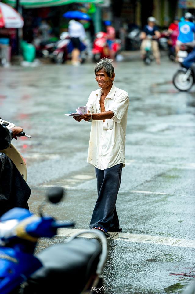 “Dòng người hối hả chạy trốn khỏi cơn mưa chỉ mình ông đứng đó với khuôn mặt rưng rưng bật khóc. Nhưng làm sao ông có thể về khi tập vé số vẫn còn dầy như vậy. Nhìn cảnh ông bạo gan đưa giữa dòng xe đưa tập vé số, cúi gập người mà xót xa. Có lẽ mình đã từng đi qua những số phận như vậy nhưng vì tất bật chạy xe mà không chú ý để giờ nhìn lại tự trách bản thân, tại sao không nán lại 1 chút!”, tài khoản V.T.H.T viết.