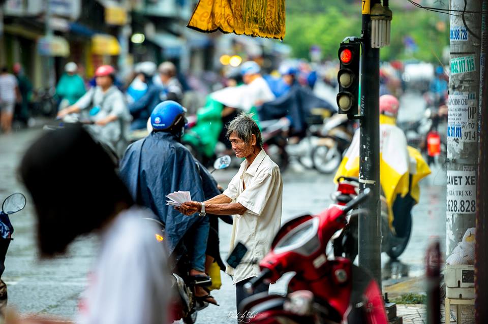 Cả một buổi cụ ông tay mời mua vé số, miệng khóc, chân rảo bước dưới cơn mưa.