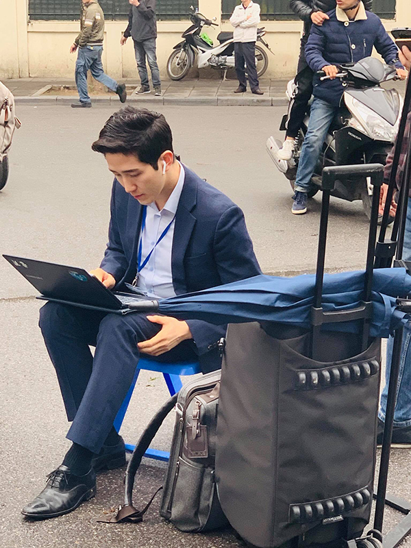 Với cách ăn mặc vest lịch sự, chỉn chu đang ngồi cập nhật tin tức trên laptop. Chiều cao lý tưởng, ánh mắt cương nghị, tập trung, nghiêm túc cùng với góc nghiêng nam tính, điển trai của anh chàng nhanh chóng khiến cư dân mạng Việt Nam “phát cuồng”.