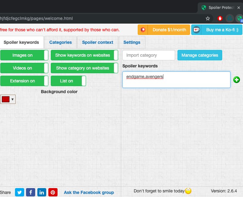 Bước 2: Truy cập giao diện Spoiler Protection 2.0 ở góc trên bên phải giao diện trình duyệt và nhập vào các từ khoá bạn muốn chặn đứng. Bạn có thể nhập vào nhiều từ khoá khác nhau và chúng được ngăn cách bằng dấu phảy. Bạn đọc lưu ý tiện ích này phân biệt cả chứ viết thường và viết hoa.