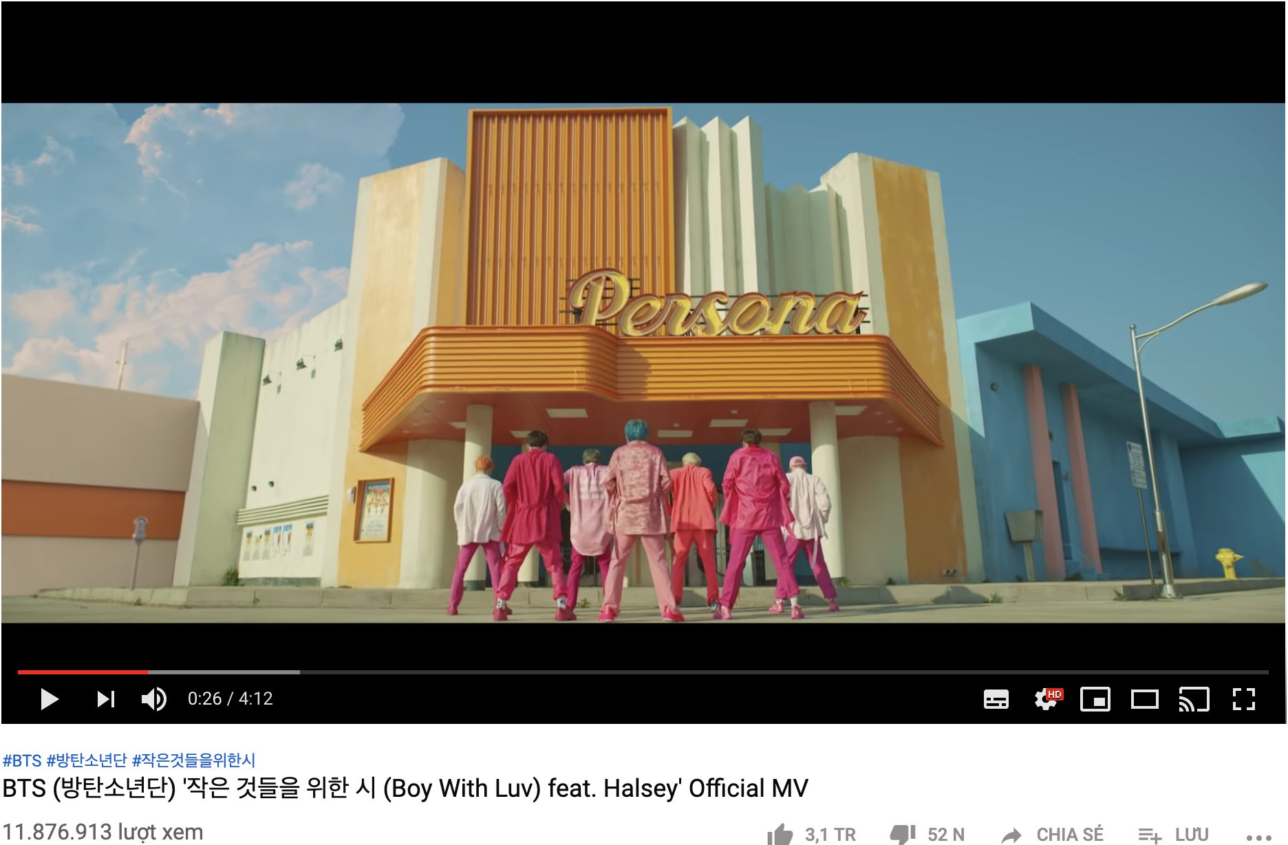 Đúng 16h ngày 12/4 (giờ địa phương), BTS đã chính thức tái xuất với MV “Boy with Luv” - ca khúc chủ đề của album “Map of the Soul: Persona”. Đây là sản phẩm hợp tác giữa nhóm nhạc 7 thành viên và Halsey - nữ ca sĩ người Mỹ nổi danh với các hit “Closer”, “Without Me”,… và cũng là lần đầu tiên BTS bắt tay sao ngoại trong bài chủ đề của toàn album.